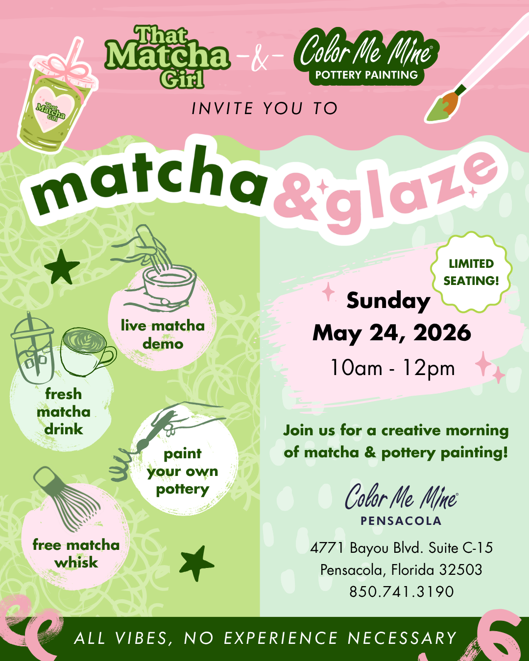 Join Color Me Mine Pensacola for Matcha & Glaze, a creative Sunday morning in collaboration with That Matcha Girl. This limited-seating event combines pottery painting with a fresh hand-whisked matcha experience for a fun, elevated outing that feels equal parts relaxing and memorable.
